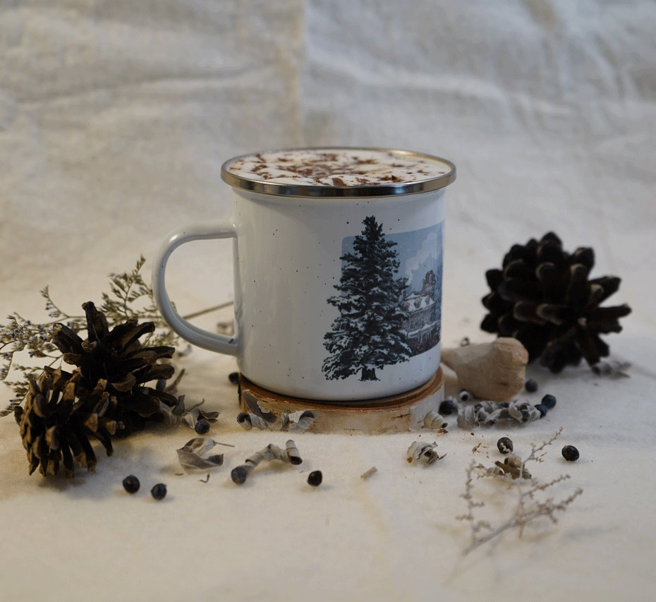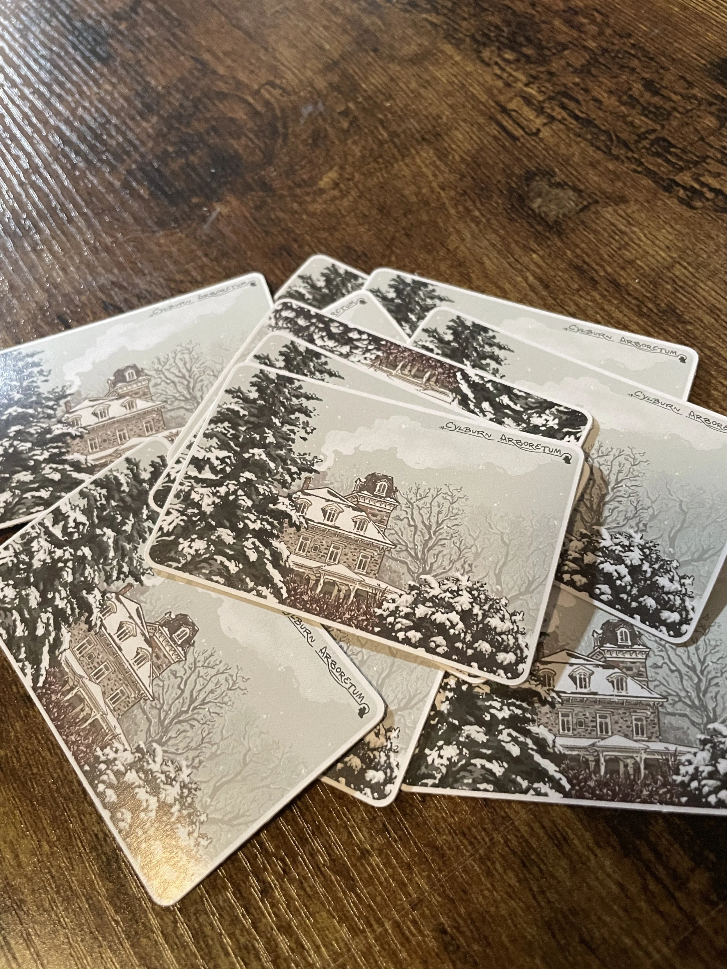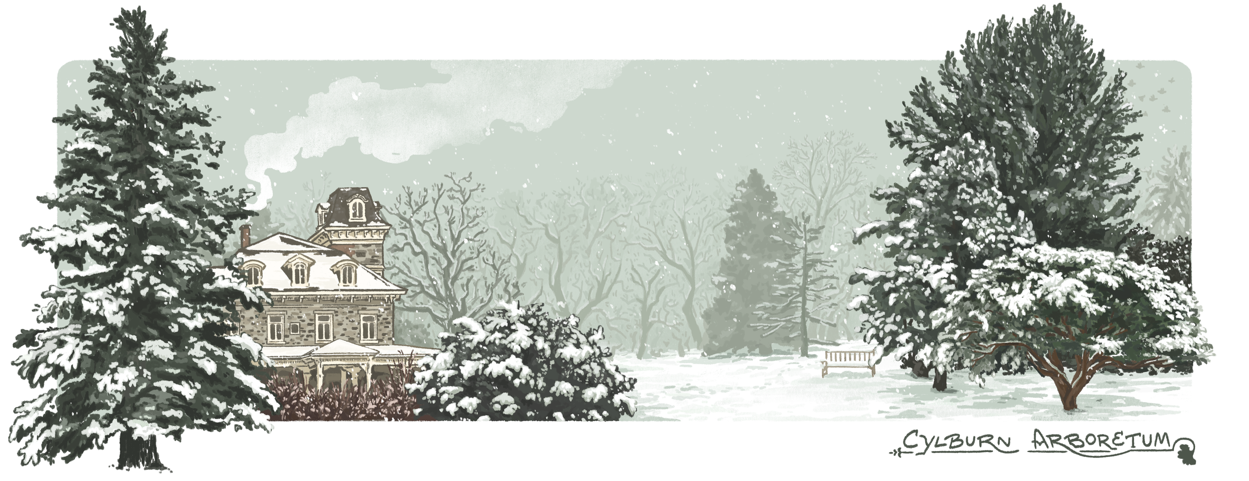 At their Holiday Greens Sale, Cylburn sells holiday garlands, boxwood wreaths, and poinsettias, all handmade and grown respecively at the Arboretum and its greenhouses. CAF reached out to me for something less ephemeral, and wanted a cozy winter scene for some enamel mugs. We quickly agreed that the historic mansion and evergreens would be the star of the show.